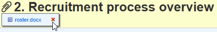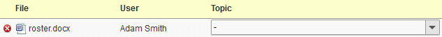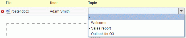 When attendees upload files to the meeting workspace during the meeting as described in "Attending a meeting", the note taker can assign the uploaded files to topics in the meeting. Files assigned are available to all attendees, and when the meeting is ended, they are saved with the meeting minutes.
